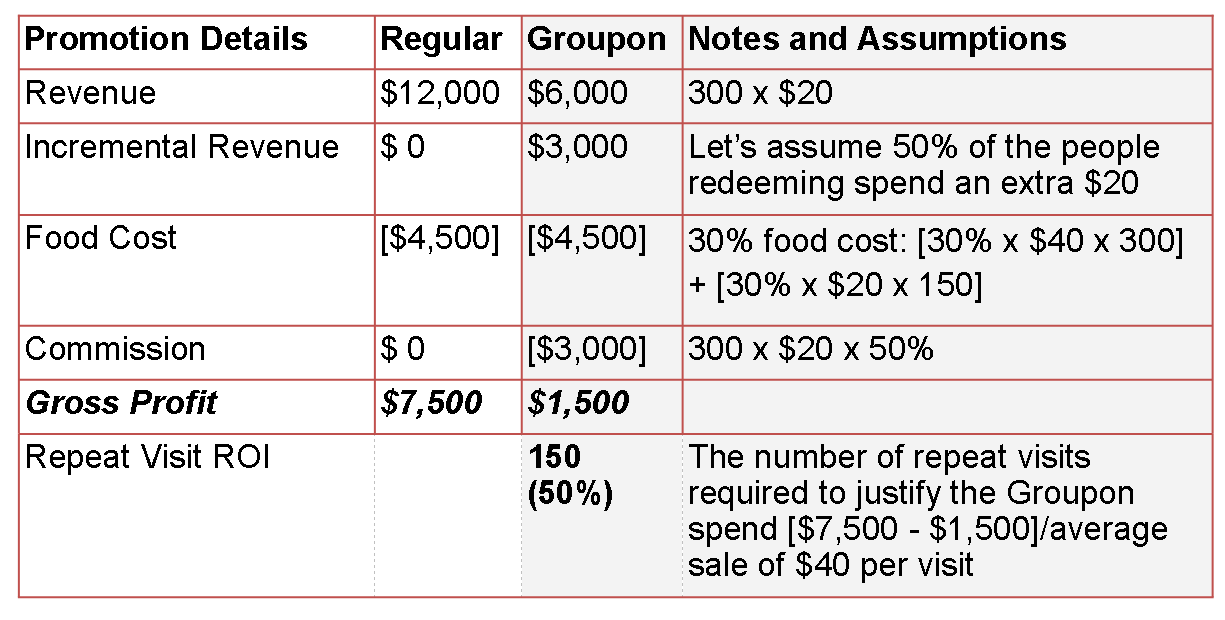 Here is a chart that breaks down an example of ROI required from a Groupon deal