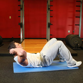 4. Lift your upper body up towards the ceiling by contracting your abs and keeping your lower back on the floor (this should not be a jerky motion, rather, a smooth controlled lift)